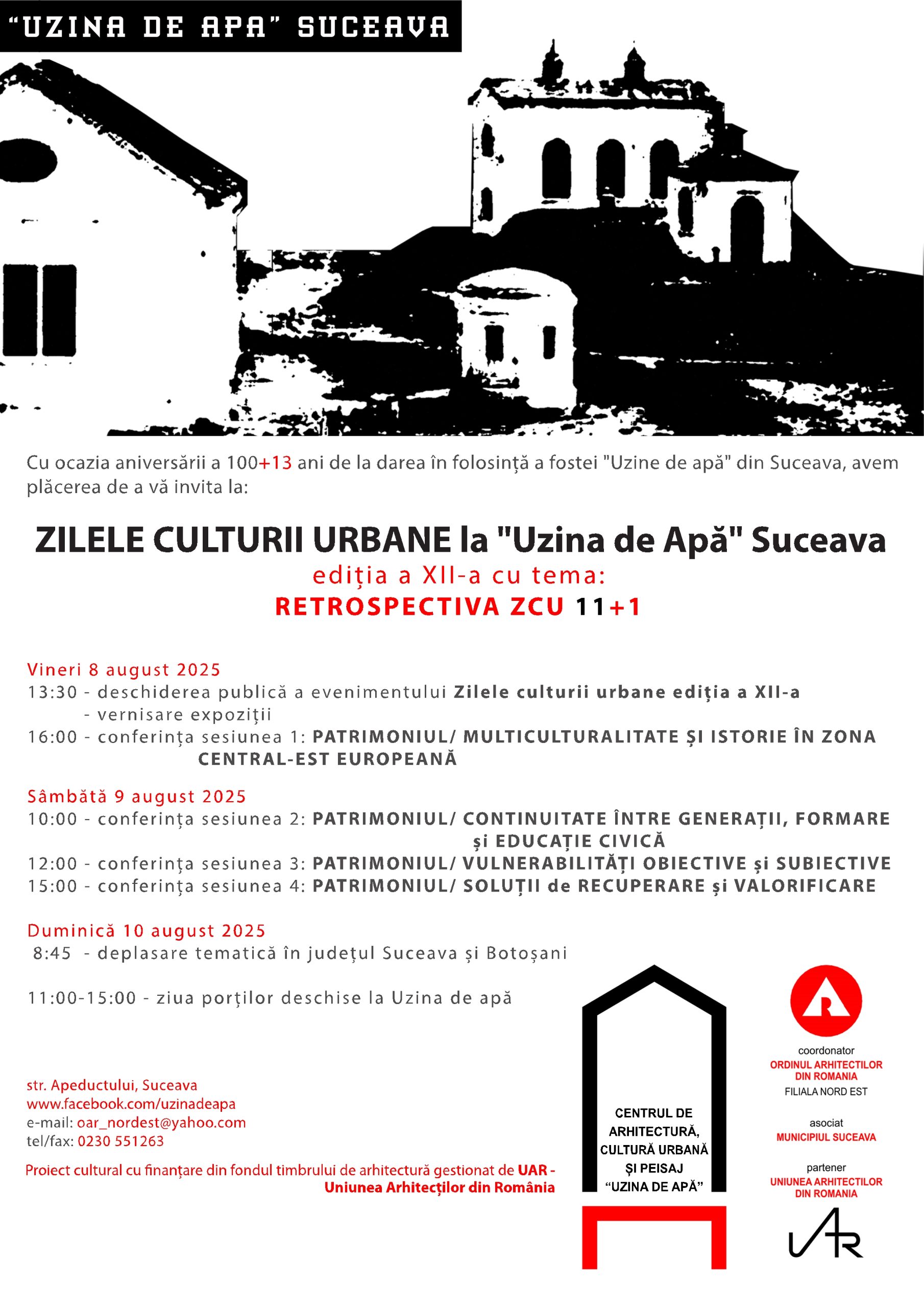 Editia de anul acesta a proiectului cultural ZILELE CULTURII URBANE la Uzina de apă – Suceava, care se va desfasura public intre 8-10 august 2025 va fi o editie retrospectiva a celor 11 ediții anterioare: